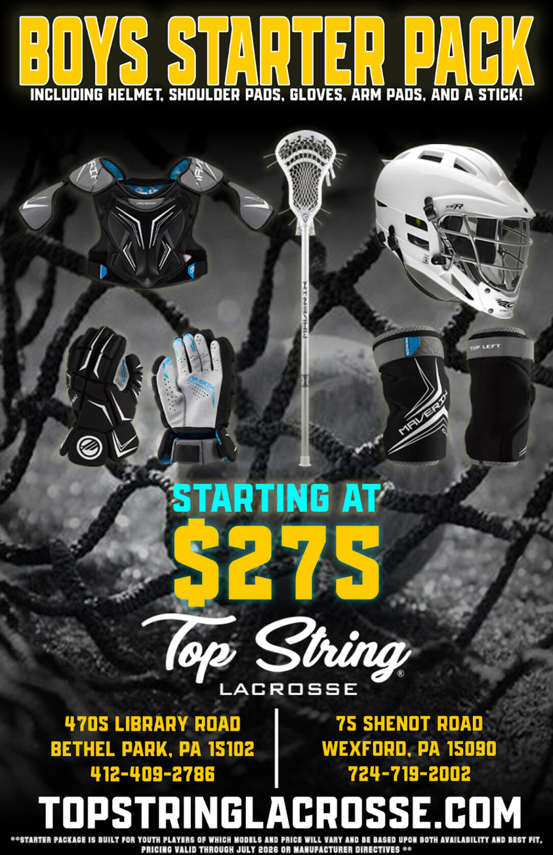 - Cleats – Turf or grass cleat; no metal spikesPlease reach out if you have any questions. We highly encourage you to visit Top String Lacrosse on their website or Wexford or Bethel Park locations. Top String Starter Package is in-store only; athletes should be present to ensure proper fitting and to design their custom strung stick.